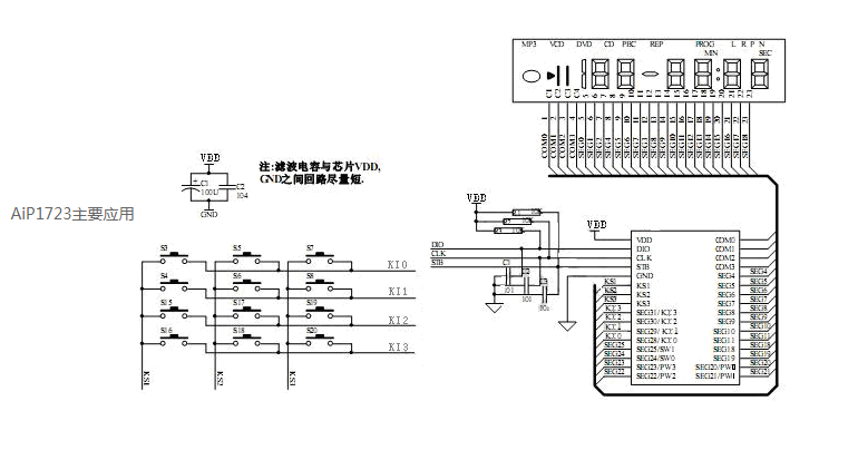 产品概述:AiP1723是一种带键盘扫描接口的LCD驱动控制专用电路,内部集成有MCU数字接口、数据锁存器、LCD驱动、键盘扫描、幻彩背光驱动等电路。本产品性能优良,质量可靠,无须更改解码板底层指令,与现有LED驱动IC的指令集完全兼容。现有的支持LED显示的解码板可以直接外接LCD显示前面板,不需要外加单片机进行按键扫描(或通过解码板扫描按键),也不需要外接按键扫描电路。同时支持PWM背光驱动和SW普通输入扩展口。
